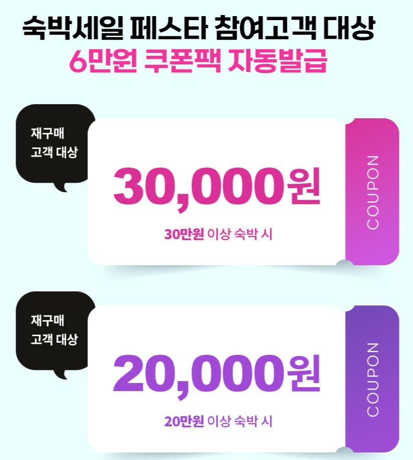 - 사용금액 : 7만 원 이상 국내 숙박상품 예약 시 - 3만 원권 사용 / 7만 원 미만 국내 숙박상품 예약 시 2만 원권 사용