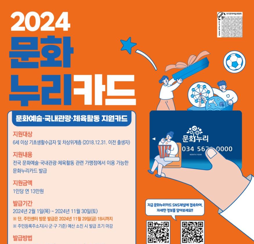 문화누리 카드는 삶의 질 향상과 문화격차 완화를 위해서 기초생활수급자, 차상위 계층을 대상으로 문화 예술, 국내여행, 체육활동을 지원하는 카드입니다. 복권기금을 활용한 정부 지원 사업인 문화누리 카드는 2023년에 1인당 11만 원씩 지원되었고, 2024에는 1인당 연간 13만 원을 지원한다고 하니 상세한 내용 살펴보시고 모두 신청하셔서 꼭 혜택 받으시기 바랍니다.