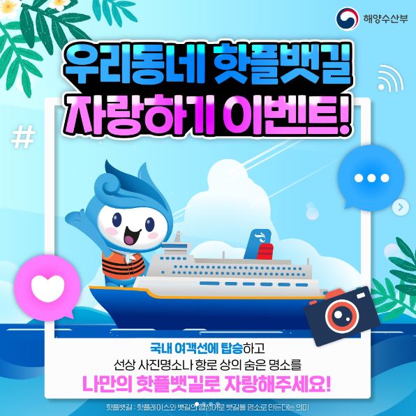 마지막으로 해양수산부에서 인스타그램에서는 '나만의 핫플뱃길' 이벤트를 진행중인데요, 여객선을 이용하고 선상 사진이나 명소 등을 자랑해주시면 좋아요 수에 따라서 1만원, 3만원, 5만원, 10만원 등의 상품이 주어진다고 하니 꼭 참여해 보시는 것도 좋을 것 같습니다. 위의 링크로 바로 들어가시면 상세한 방법 안내를 받을 수 있습니다.