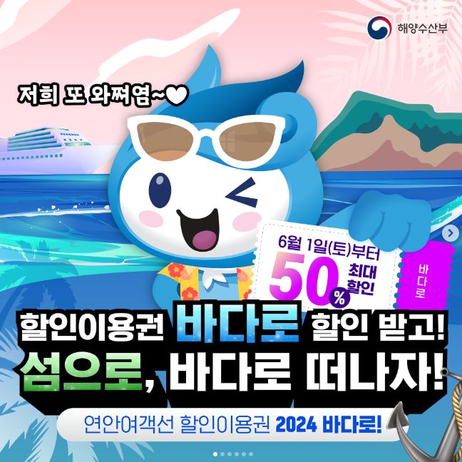 7월이 되면서 본격적으로 여름 휴가 계획 잡으시는 분들이 많습니다. 여름 여행으로 섬 여행을 계획하고 계신분들을 위해서 해양수산부와 한국해운조합이 추진하고 있는 사업인 <2024 바다로>를 통해서 39개 항로, 48여척의 여객선을 최대 50% 할인된 운임으로 이용 가능하다고 하는데요, 그 대상도 확대되었다고 하니 빨리 구매하셔서 여객선 비용 지원받고 여행 떠나보시기 바랍니다.