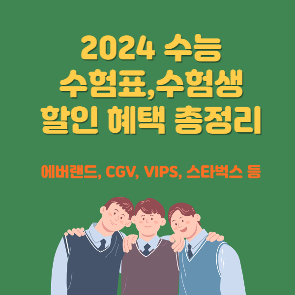 11월이 되면 빼놓을 수 없는 것이 바로 수능시험입니다. 수능이 끝나면 그동안 고생한 수험생 들을 위해서 여러 곳에서 다양한 혜택이 주어지는데요, 각각 찾아보기 힘드셔서 모르고 지나칠 수 있는 혜택들을 한곳에 정리해서 모아봤습니다. 그동안 공부하느라 고생한 수험생들은 물론, 함께 응원한 가족들까지 아래에 혜택 잘 살펴보시고 놓치지 말고 모두 누려 보시기 바랍니다.