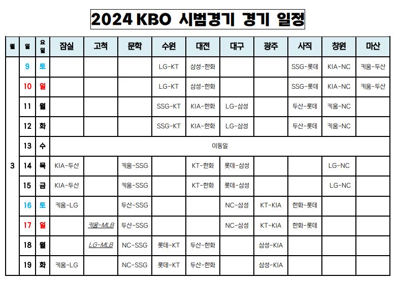 먼저 2024 KBO 시범경기 경기 일정을 알아보겠습니다. 3월 9일(토)부터 19일(화)까지 팀당 10경기, MLB 서울 개막전에 앞서 연습경기를 치르는 LG와 키움은 각각 8경기로 총 48경기가 편성되었습니다. 이번 시범 경기에서 마산 구장을 중립 구장으로 뒀으며 출장 선수 인원 제한은 없어서 소속 선수 및 육성선수 모두가 출장이 가능하다고 합니다.