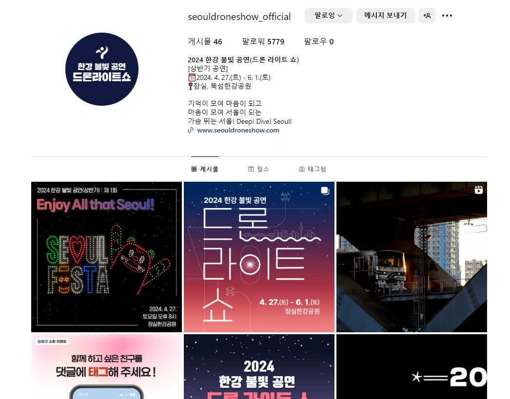 2024 드론 라이트쇼는 야외 행사인 만큼 날씨에 영향을 받을 수밖에 없는데요, 우천, 강풍 등 기상 상황에 따라 공연이 지연 또는 취소될 수도 있다고 합니다. 특별한 관람을 기대하고 방문했는데 공연이 취소되어 허탈하게 돌아오는 일이 없기 위해서는 사전에 확인 후 방문하는 것이 좋을 것 같은데요, 기상 악화 시 행사 진행 여부나 2024 한강 불빛 공연(드론 라이트 쇼) 관련 자세한 사항은 인스타그램, 누리집에서 사전에 공지된다고 합니다.
