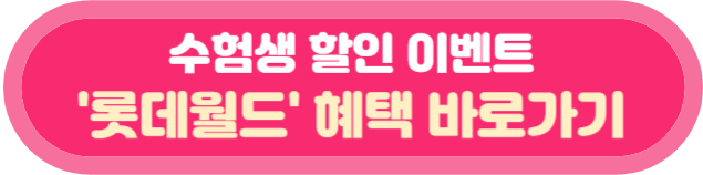 롯데월드는 2024년 11월 14일(목)부터 11월 30일(토)까지 수험생 본인을 대상으로 최대 약 58% 할인된 가격으로 자유이용권 이용이 가능합니다. 할인 방법은 현장 매표소, 키오스크, 온라인 구매로 모두 가능하고 입장 시 수험표 등의 증빙서류를 지참하셔서 확인을 받으셔야 합니다.