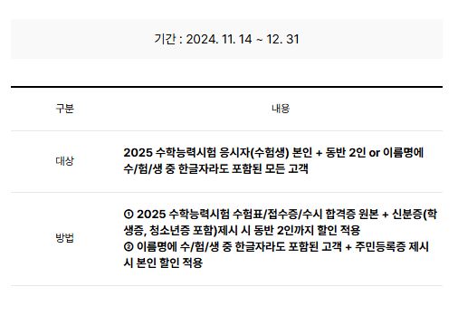 적용기간은 2024년 11월 1일 오전 10시부터 2025년 1월 31일까지이고, 탑승기간은 2024년 11월 1일부터 2025년 2월 21일까지입니다. 할인조건은 2025년 수능 수험표, 원서 접수증, 대입 지원서 중 택 1 증빙이 필수이며, 수험생 본인에 한해서만 할인 대상으로 적용된다고 하니 참고하시기 바랍니다.