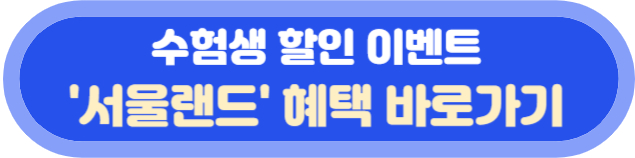 서울랜드는 2024년 11월 14일부터 12월 31일까지 수고했수능, 여기서 놀다가! 이벤트를 진행합니다. 먼저 수험생 본인에 대해서 약 61% 할인된 20,500원에 종일 이용권 이용이 가능하고, 동반 2인까지 동일 금액으로 이용이 가능합니다. 두번째 이벤트로 이름에 수/험/생 중 한글자라도 포함된 고객에 대해서 수험생과 동일하게 61% 할인 된 20,500원에 이용권 구입이 가능하다고 합니다.