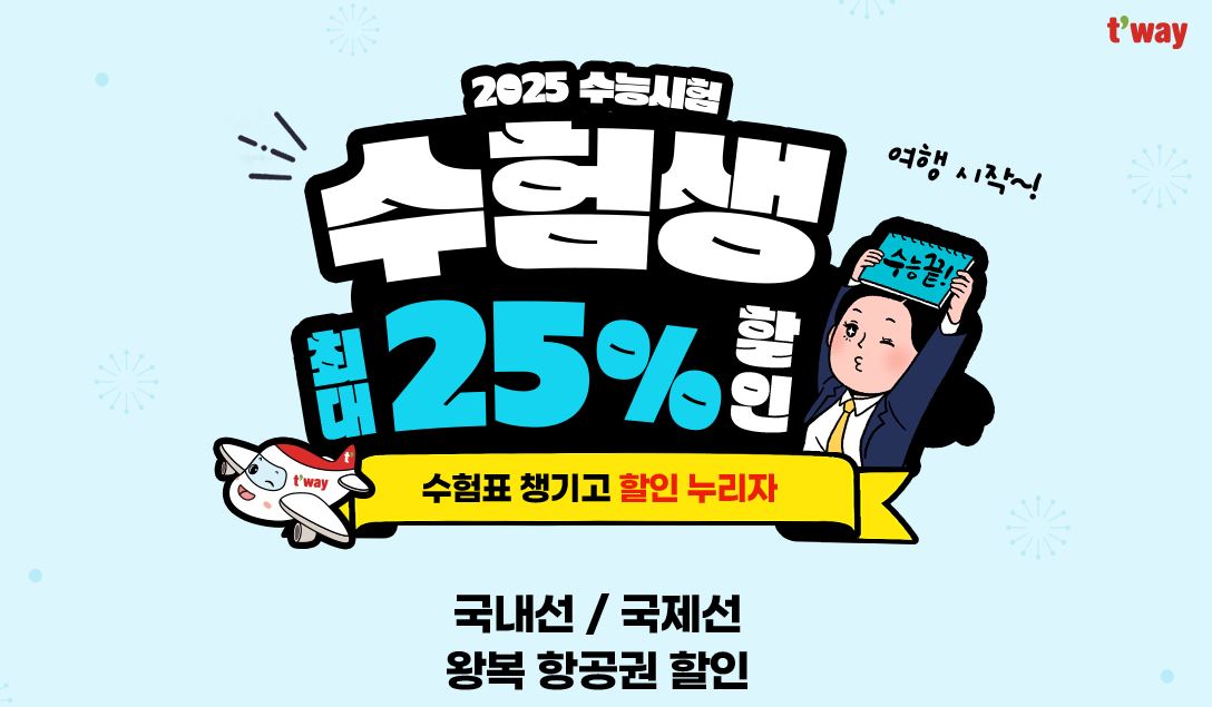 수능이 끝나고 그 동안 공부하느라 받은 스트레스를 풀기 위해, 혹은 가족들과 시간을 보내기 위해 여행을 계획하고 있는 수험생들에게 티웨이 항공에서는 수험생 보인 한정으로 최대 25% 항공 할인을 진행합니다. 국내선의 경우 왕복 예매 시 25% 할인, 국제선의 경우 왕복 예매 시 최대 10% 할인이 진행된다고 합니다.