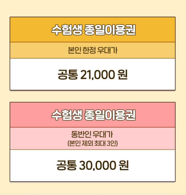 일일 자유이용권의 경우 우대가 26,000원, 오후권의 경우 우대가 20,000원으로 이용할 수 있는데요, 2025 수학능력시험 수험표, 접수증, 수시합격증 원본과 함께 사진이 부착된 신분증인 학생증이나 청소년증을 소지하시면 됩니다. 타 우대와 중복 할인을 되지 않으며, 증명자료 원본 제시시에만 우대가 가능하다고 하니 꼭 지참하셔서 혜택 받으시기 바랍니다.
