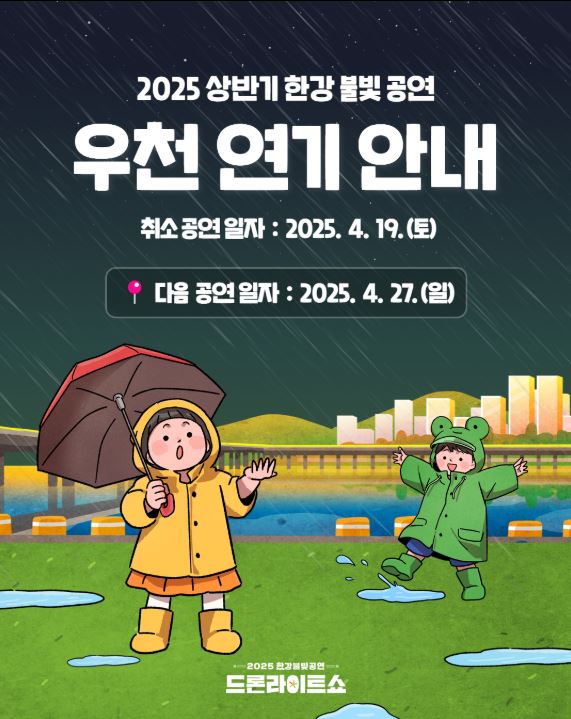 2025 '드론 라이트 쇼'는 처음 4월 12일(토) 공연을 1회차로 시작하여 5월 11일(일)까지 5회차 공연을 진행 예정이었으나, 4월 12일(토)은 우천으로 취소되었고, 4월 19일(토) 공연 역시 우천 예보로 인하여 취소되었습니다. 취소된 두번의 공연은 연기되어 5월 25일(일)과 6월 15일(일)에 진행된다고 하니 전체 일정인 5회차 공연은 모두 진행될 것으로 보여집니다.