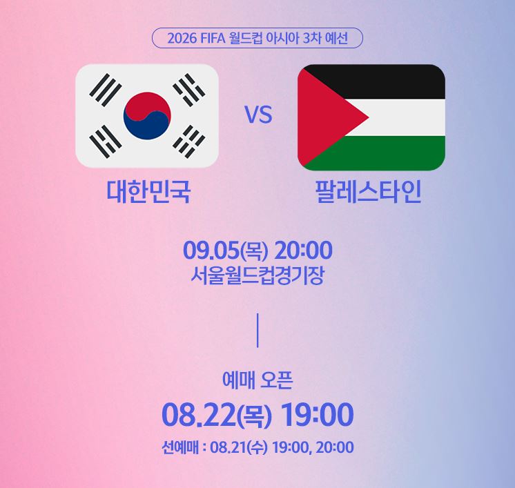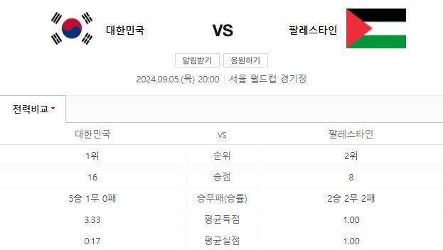 | 1차전 | 2024년 9월 5일(목) 20:00 | 팔레스타인 | 홈 (한국) / 서울월드컵 경기장 |