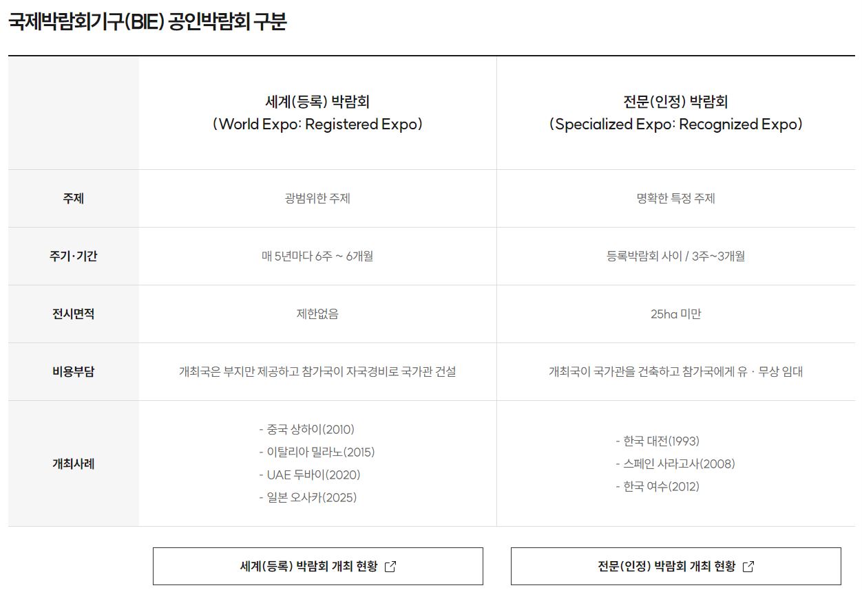 1928년 창립된 BIE는 박람회를 종합박람회와 전문박람회로 구분합니다. 1988년 협약 개정으로 현재는 세계(등록) 박람회와 전문(인정) 박람회로 구분하고, 등록박람회 개최주기를 5년으로 정하여 0과 5로 끝나는 연도에 개최합니다.