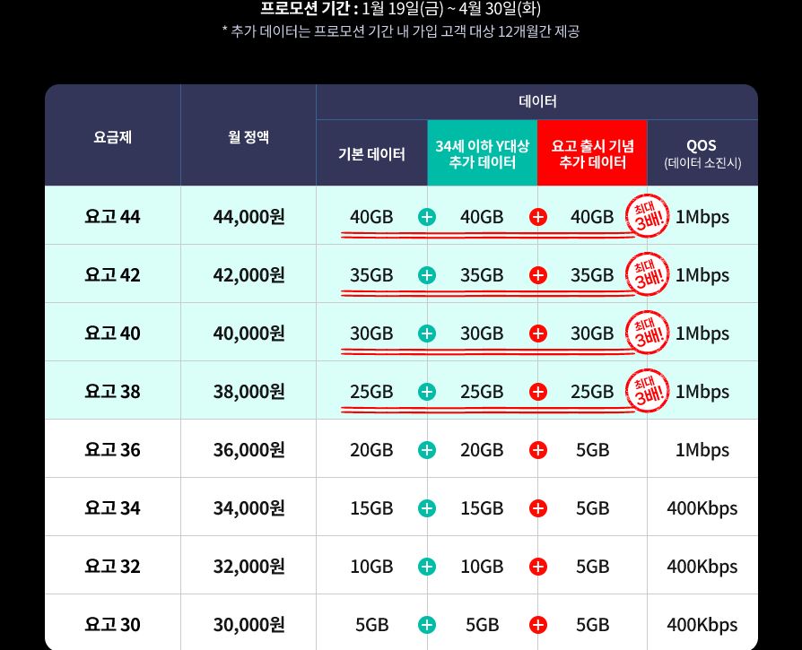 특히 요고 출시 기념으로 1년 동안 요고38 요금제부터는 기본 데이터만큼의 데이터가 추가로, 요고 30 부터 요고 36 까지는 5기가의 데이터가 추가로 제공된다고 하니 요고 38 요금제 이상을 사용하는 34세 이하의 경우에는 무려 3배의 데이터를 제공받을 수 있습니다. 행사 기간은 24년 1월 19일부터 4월 30일 까지라고 하니 고려해 보시는 것을 추천드립니다.