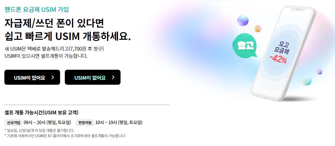 세 번째, 자급제 폰이나 쓰던 폰이 있다면 KT 유심을 구입해서 셀프 개통하는 것도 가능합니다. 새 USIM 구입 시 7,700원 청구 후 택배 발송 받을 수 있으며, 구입한 USIM이 있으시다면 바로 개통도 가능하다고 하니 아래 바로 가기로 가셔서 직접 해보시는 것도 추천드립니다.