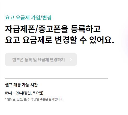 두 번째, 꼭 KT에서 기기를 구입하지 않더라도 자급제 폰이나 중고폰을 KT에 등록하고 요고 요금제로 변경하는 것도 가능합니다. 유의하셔야 할 점은 현재 사용 중인 핸드폰으로는 요고 요금제로 변경이 불가하고, 미사용 상태의 중고폰이나 자급제 핸드폰과 같이 공기계가 준비되어야 한다는 것입니다. 아래로 바로 가기로 가셔서 직접 등록하고 요금제를 변경할 수 있으니 참고하시기 바랍니다.