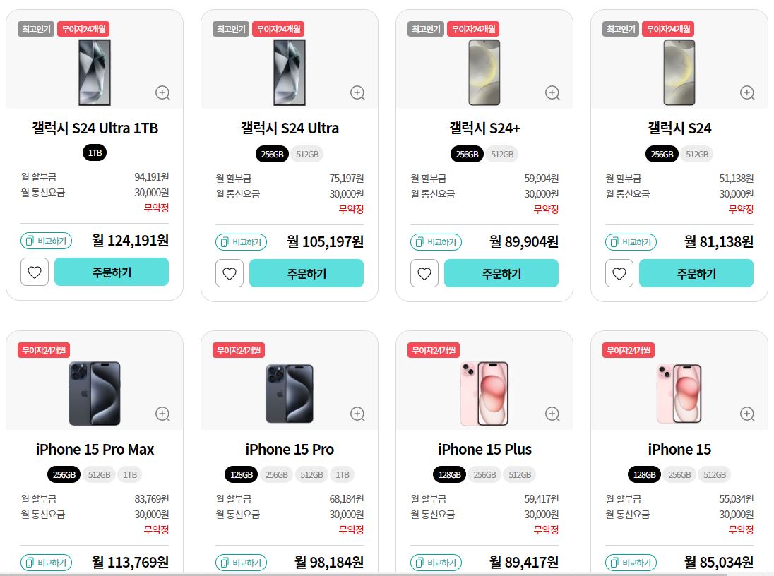 첫 번째, 만약 요금제 변경과 함께 핸드폰 기기를 구입하실 계획이라면 카드 무이자 24개월 할부 선택을 추천합니다. 보통 단말기 대금을 통신사 할부로 진행할 경우 할부 수수료가 최대 15만 원까지 포함되어서 매달 기기값이 청구되는데요, 본인이 기존에 소지하고 있는 신용카드 중 현대/신한/국민/삼성/BC/하나/롯데/농협/우리 카드로 결제하면서 24개월 무이자로 선택하시면 할부수수료를 절약할 수 있습니다.