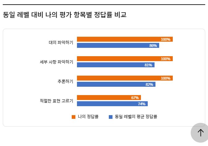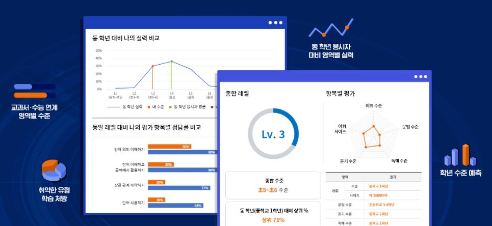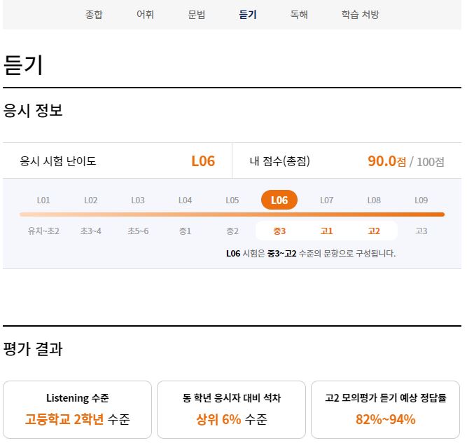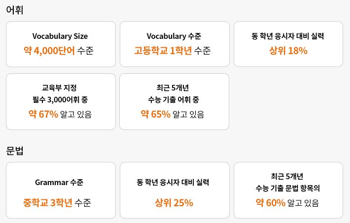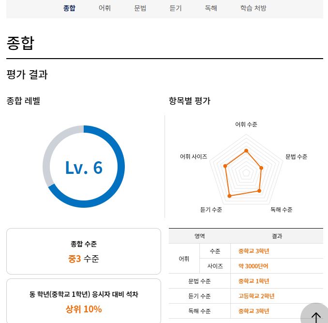 다섯 번째, 무엇보다도 성적표가 매우 상세하게 나왔습니다. 동 학년과 동 레벨 응시자 대비 실력을 파악해서 비교해 주고, 교육부 지정 필수 어휘 기준으로 어휘력을 판단해 보여주고 있으며, 수능 5개년 기출, 시/도 교육청 듣기 평가 비교 등 응시자의 실력을 다방면으로 비교, 분석하여 보여줘서 생각보다 조금 놀라웠습니다. 더불어 필요한 공부법도 알려주고 있는 점이 좋았습니다.