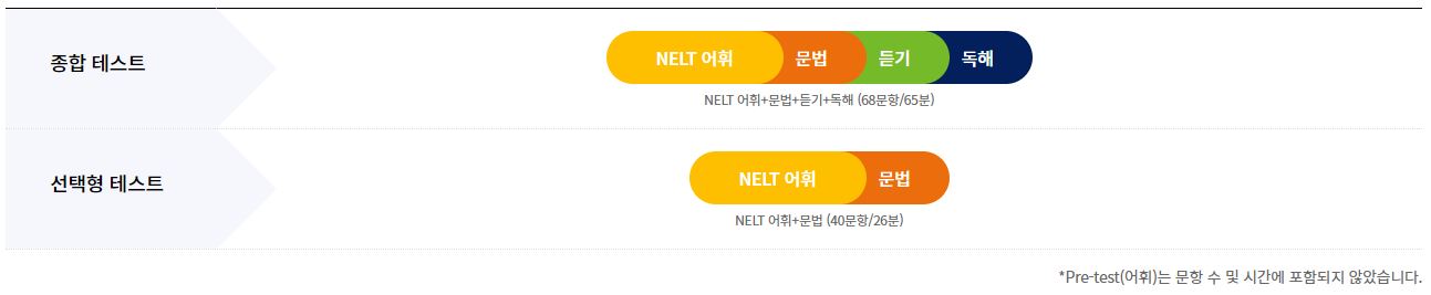 넬트는 어휘, 문법, 듣기, 독해의 4대 영역을 종합적으로 테스트 볼 수 있는 종합권과 어휘, 문법 항목에 대해 선택적으로 테스트를 볼 수 있는 부분권으로 나누어져 있습니다. 종합 테스트의 경우 4과목 68문항 65분이 소요되며, 선택형 테스트의 경우 2과목 40문항 26분이 소요됩니다.
