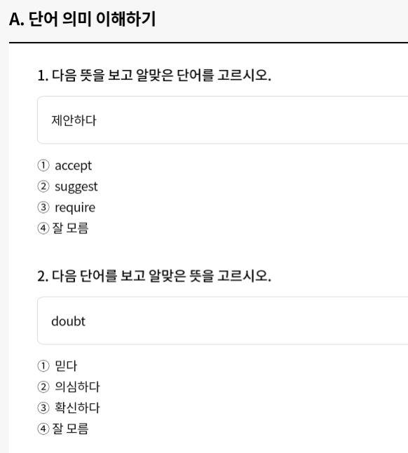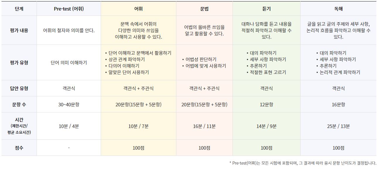 네 번째, Pre-test의 결과에 따라 응시자의 수준에 적합한 어휘, 문법, 듣기, 독해 문제를 출제하고 있는데요, 고정으로 정해져있는 문제가 아니라 문항에 답하는 것에 따라서 다음 문제를 반응형으로 제시하고 있어서 보다 정확하게 측정이 가능하다는 생가깅 들었습니다.